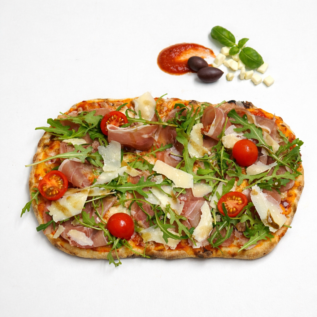 Sos rosii, mozzarella, prosciutto crudo, rucola, parmezan, rosii cherry, crema de otet balsamic