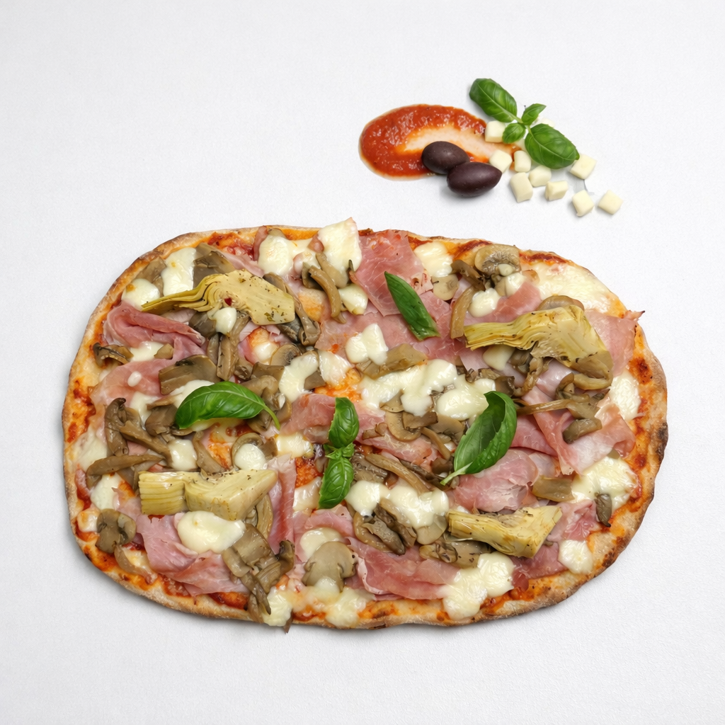 Sos rosii, mozzarella, prosciutto cotto, anghinare, ciuperci