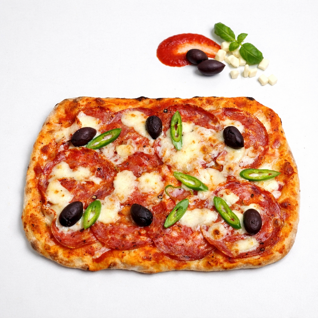 Sos rosii, mozzarella, salam spianata, masline, ardei iute