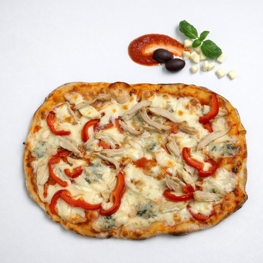 Sos rosii, mozzarella, pui, gorgonzola, ardei rosu