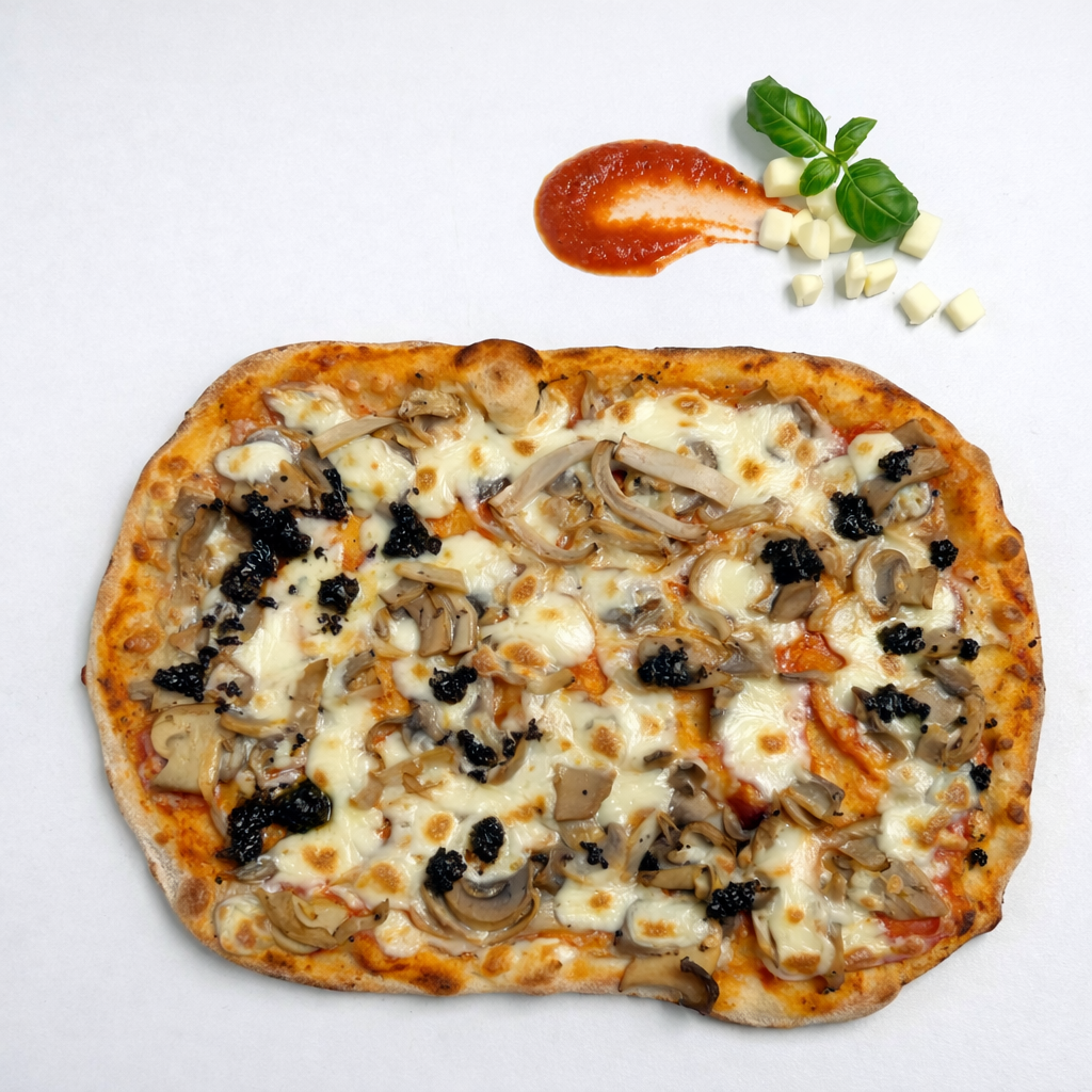 Sos rosii, mozzarella, mix ciuperci si sos trufe negre