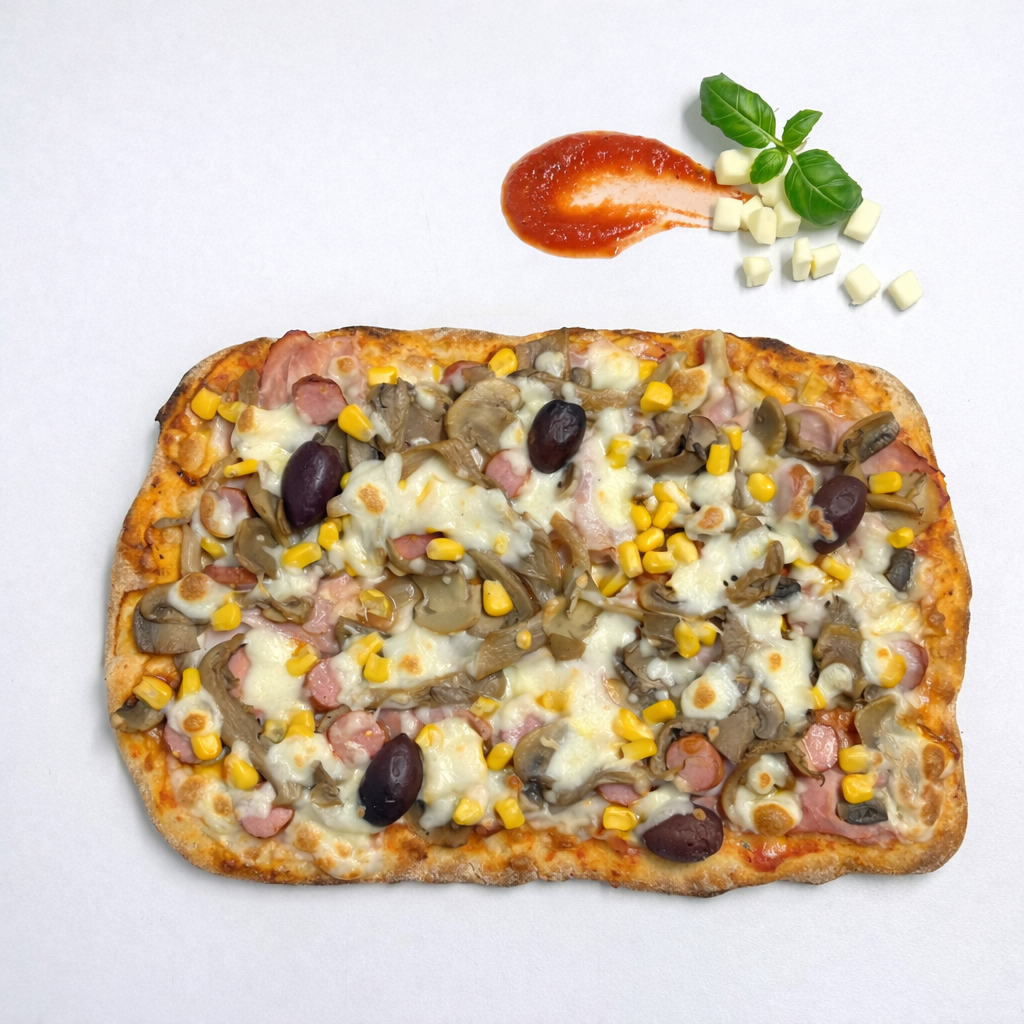Sos rosii, mozzarella, prosciutto cotto, porumb, carnaciori, ciuperci, masline
