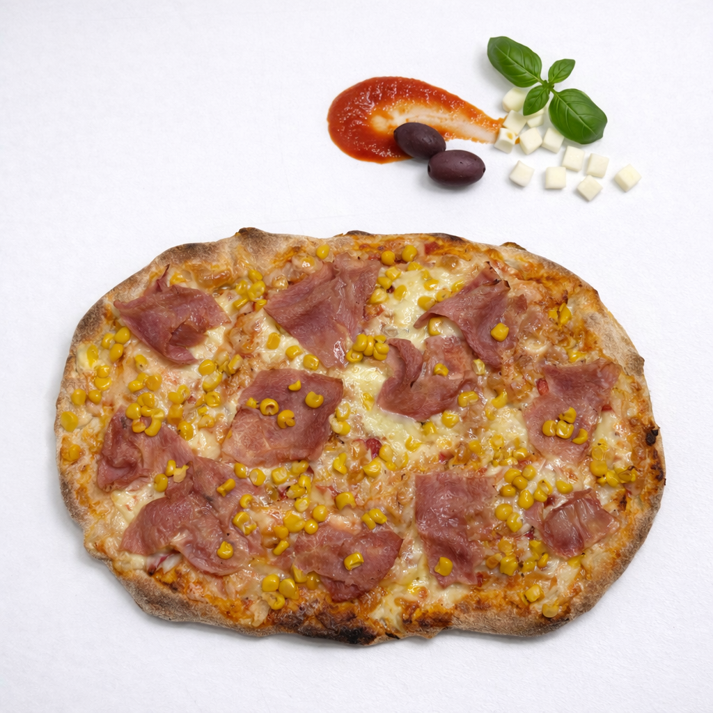 Sos rosii, mozzarella, prosciutto cotto, porumb